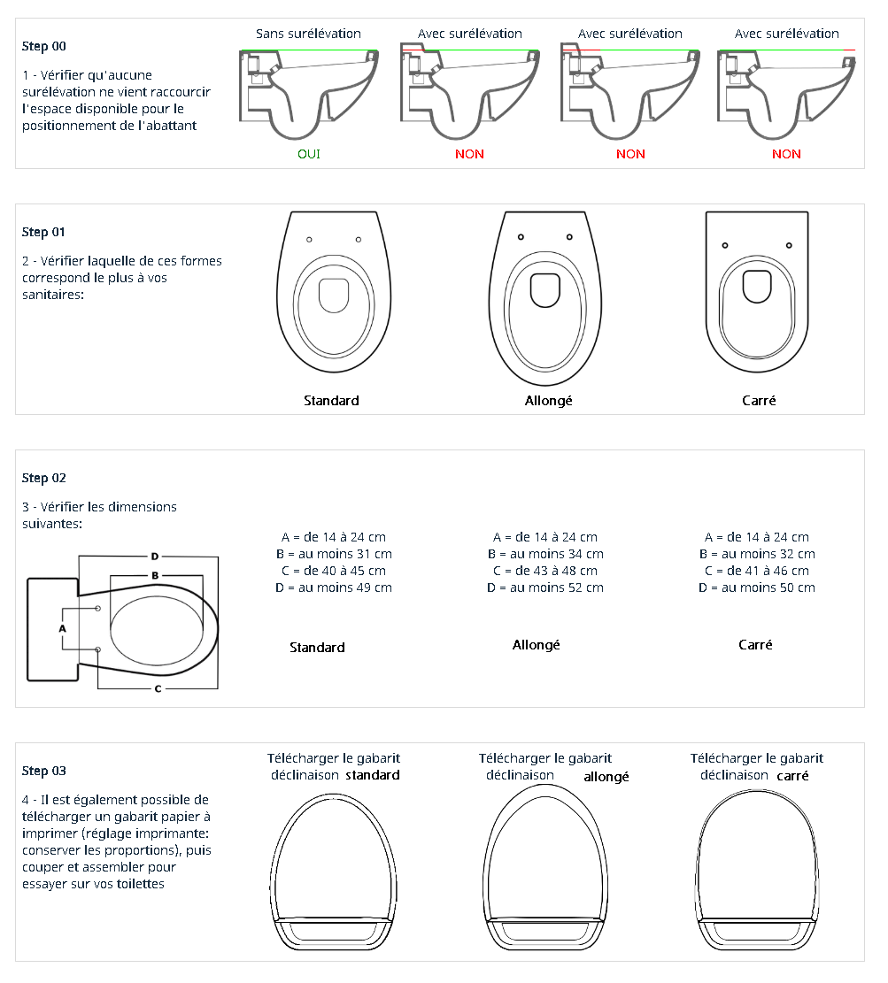 Vous trouverez les dimensions de chaque version dans les fichiers en téléchargement ci-dessus ou bien imprimez directement les gabarits et placez-les sur votre cuvette. Vous visualiserez ainsi l’adaptabilité de notre abattant !